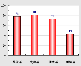 環境運 家庭や職場等での援助運・環境運を司ります。これが良いと配偶者や子供・職場の同僚などから助力が得られやすく、悪いと波乱・不和・孤独などがあります。 43点