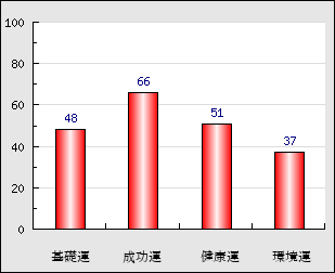 成功運 目的に対する成功運の強さをあらわします。この点数が高いほど自分の思い通りに成功し、逆に悪いと逆境・批判・障害などに苦心します。 66点