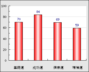 成功運 目的に対する成功運の強さをあらわします。この点数が高いほど自分の思い通りに成功し、逆に悪いと逆境・批判・障害などに苦心します。 84点