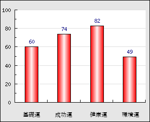 環境運 家庭や職場等での援助運・環境運を司ります。これが良いと配偶者や子供・職場の同僚などから助力が得られやすく、悪いと波乱・不和・孤独などがあります。 49点