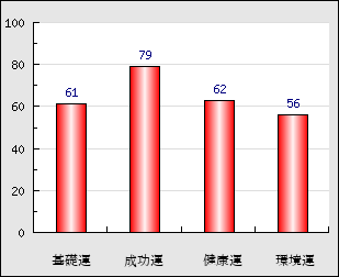 成功運 目的に対する成功運の強さをあらわします。この点数が高いほど自分の思い通りに成功し、逆に悪いと逆境・批判・障害などに苦心します。 79点