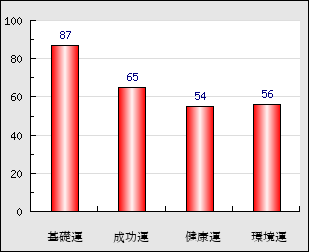 成功運 目的に対する成功運の強さをあらわします。この点数が高いほど自分の思い通りに成功し、逆に悪いと逆境・批判・障害などに苦心します。 65点