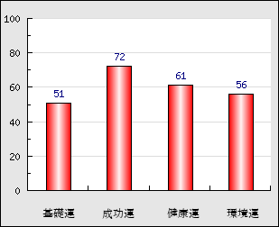 成功運 目的に対する成功運の強さをあらわします。この点数が高いほど自分の思い通りに成功し、逆に悪いと逆境・批判・障害などに苦心します。 72点
