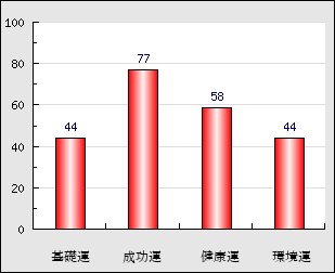 成功運 目的に対する成功運の強さをあらわします。この点数が高いほど自分の思い通りに成功し、逆に悪いと逆境・批判・障害などに苦心します。 77点