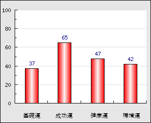 成功運 目的に対する成功運の強さをあらわします。この点数が高いほど自分の思い通りに成功し、逆に悪いと逆境・批判・障害などに苦心します。 65点