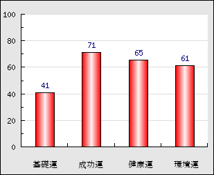 成功運 目的に対する成功運の強さをあらわします。この点数が高いほど自分の思い通りに成功し、逆に悪いと逆境・批判・障害などに苦心します。 71点