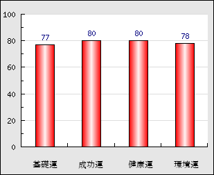 環境運 家庭や職場等での援助運・環境運を司ります。これが良いと配偶者や子供・職場の同僚などから助力が得られやすく、悪いと波乱・不和・孤独などがあります。 78点