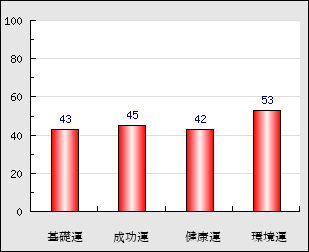 環境運 家庭や職場等での援助運・環境運を司ります。これが良いと配偶者や子供・職場の同僚などから助力が得られやすく、悪いと波乱・不和・孤独などがあります。 53点