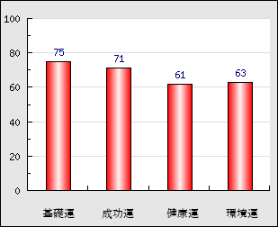 環境運 家庭や職場等での援助運・環境運を司ります。これが良いと配偶者や子供・職場の同僚などから助力が得られやすく、悪いと波乱・不和・孤独などがあります。 63点