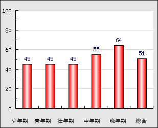 ※年代別運勢グラフは、あくまでも時期別の運勢を概算したものですので参考程度にご覧ください。少年期や青年期の運勢が平均と比べて高い場合は比較的若い頃に成功や幸福があり、反対に中年期や晩年期の運勢が平均と比べて高い場合は後年に華開く大器晩成型と言えるでしょう。ただし、少年期の運勢が低いからと言って、若い頃は成功しないといったことではありません。