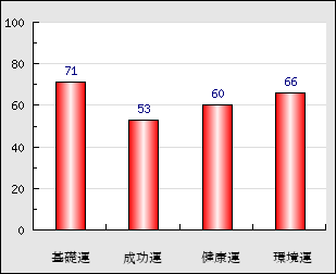 成功運 目的に対する成功運の強さをあらわします。この点数が高いほど自分の思い通りに成功し、逆に悪いと逆境・批判・障害などに苦心します。 53点