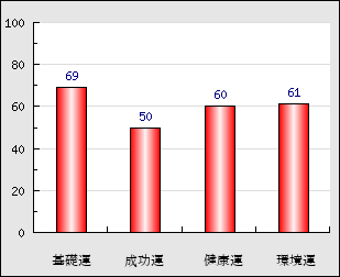 成功運 目的に対する成功運の強さをあらわします。この点数が高いほど自分の思い通りに成功し、逆に悪いと逆境・批判・障害などに苦心します。 50点