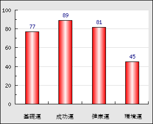 環境運 家庭や職場等での援助運・環境運を司ります。これが良いと配偶者や子供・職場の同僚などから助力が得られやすく、悪いと波乱・不和・孤独などがあります。 45点