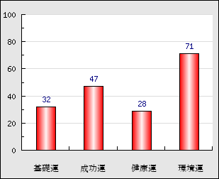 成功運 目的に対する成功運の強さをあらわします。この点数が高いほど自分の思い通りに成功し、逆に悪いと逆境・批判・障害などに苦心します。 47点