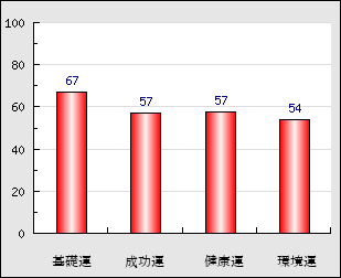 成功運 目的に対する成功運の強さをあらわします。この点数が高いほど自分の思い通りに成功し、逆に悪いと逆境・批判・障害などに苦心します。 57点