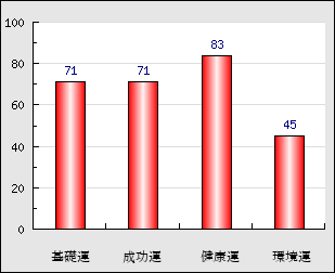 環境運 家庭や職場等での援助運・環境運を司ります。これが良いと配偶者や子供・職場の同僚などから助力が得られやすく、悪いと波乱・不和・孤独などがあります。 45点