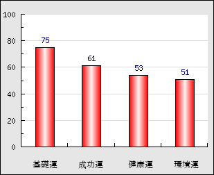 成功運 目的に対する成功運の強さをあらわします。この点数が高いほど自分の思い通りに成功し、逆に悪いと逆境・批判・障害などに苦心します。 61点