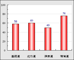 環境運 家庭や職場等での援助運・環境運を司ります。これが良いと配偶者や子供・職場の同僚などから助力が得られやすく、悪いと波乱・不和・孤独などがあります。 76点