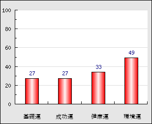 環境運 家庭や職場等での援助運・環境運を司ります。これが良いと配偶者や子供・職場の同僚などから助力が得られやすく、悪いと波乱・不和・孤独などがあります。 49点