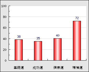 成功運 目的に対する成功運の強さをあらわします。この点数が高いほど自分の思い通りに成功し、逆に悪いと逆境・批判・障害などに苦心します。 35点