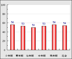 ※年代別運勢グラフは、あくまでも時期別の運勢を概算したものですので参考程度にご覧ください。少年期や青年期の運勢が平均と比べて高い場合は比較的若い頃に成功や幸福があり、反対に中年期や晩年期の運勢が平均と比べて高い場合は後年に華開く大器晩成型と言えるでしょう。ただし、少年期の運勢が低いからと言って、若い頃は成功しないといったことではありません。