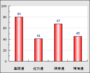 成功運 目的に対する成功運の強さをあらわします。この点数が高いほど自分の思い通りに成功し、逆に悪いと逆境・批判・障害などに苦心します。 41点