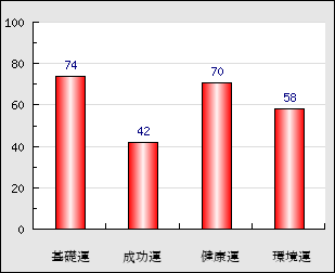 成功運 目的に対する成功運の強さをあらわします。この点数が高いほど自分の思い通りに成功し、逆に悪いと逆境・批判・障害などに苦心します。 42点