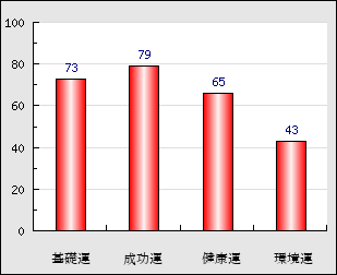 成功運 目的に対する成功運の強さをあらわします。この点数が高いほど自分の思い通りに成功し、逆に悪いと逆境・批判・障害などに苦心します。 79点