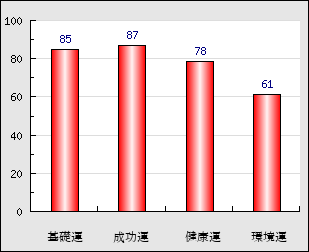 環境運 家庭や職場等での援助運・環境運を司ります。これが良いと配偶者や子供・職場の同僚などから助力が得られやすく、悪いと波乱・不和・孤独などがあります。 61点