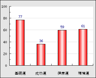 環境運 家庭や職場等での援助運・環境運を司ります。これが良いと配偶者や子供・職場の同僚などから助力が得られやすく、悪いと波乱・不和・孤独などがあります。 61点