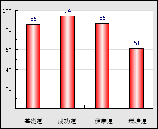 成功運 目的に対する成功運の強さをあらわします。この点数が高いほど自分の思い通りに成功し、逆に悪いと逆境・批判・障害などに苦心します。 94点