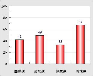 環境運 家庭や職場等での援助運・環境運を司ります。これが良いと配偶者や子供・職場の同僚などから助力が得られやすく、悪いと波乱・不和・孤独などがあります。 67点