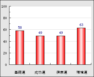 環境運 家庭や職場等での援助運・環境運を司ります。これが良いと配偶者や子供・職場の同僚などから助力が得られやすく、悪いと波乱・不和・孤独などがあります。 63点