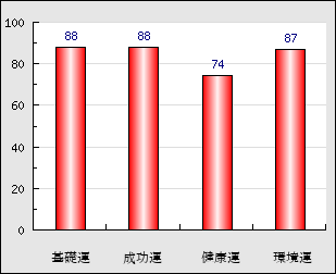 環境運 家庭や職場等での援助運・環境運を司ります。これが良いと配偶者や子供・職場の同僚などから助力が得られやすく、悪いと波乱・不和・孤独などがあります。 87点