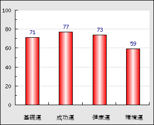 成功運 目的に対する成功運の強さをあらわします。この点数が高いほど自分の思い通りに成功し、逆に悪いと逆境・批判・障害などに苦心します。 77点