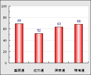 環境運 家庭や職場等での援助運・環境運を司ります。これが良いと配偶者や子供・職場の同僚などから助力が得られやすく、悪いと波乱・不和・孤独などがあります。 68点