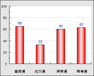 環境運 家庭や職場等での援助運・環境運を司ります。これが良いと配偶者や子供・職場の同僚などから助力が得られやすく、悪いと波乱・不和・孤独などがあります。 63点