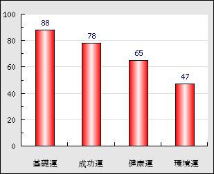 成功運 目的に対する成功運の強さをあらわします。この点数が高いほど自分の思い通りに成功し、逆に悪いと逆境・批判・障害などに苦心します。 78点