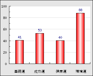 環境運 家庭や職場等での援助運・環境運を司ります。これが良いと配偶者や子供・職場の同僚などから助力が得られやすく、悪いと波乱・不和・孤独などがあります。 88点