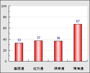 成功運 目的に対する成功運の強さをあらわします。この点数が高いほど自分の思い通りに成功し、逆に悪いと逆境・批判・障害などに苦心します。 37点