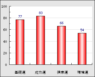 成功運 目的に対する成功運の強さをあらわします。この点数が高いほど自分の思い通りに成功し、逆に悪いと逆境・批判・障害などに苦心します。 83点