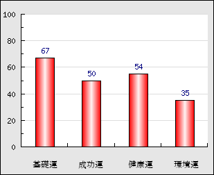 成功運 目的に対する成功運の強さをあらわします。この点数が高いほど自分の思い通りに成功し、逆に悪いと逆境・批判・障害などに苦心します。 50点