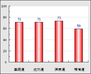 環境運 家庭や職場等での援助運・環境運を司ります。これが良いと配偶者や子供・職場の同僚などから助力が得られやすく、悪いと波乱・不和・孤独などがあります。 59点