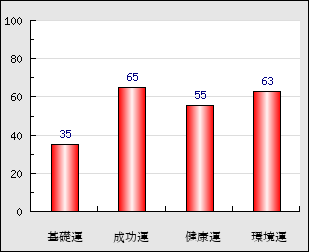 成功運 目的に対する成功運の強さをあらわします。この点数が高いほど自分の思い通りに成功し、逆に悪いと逆境・批判・障害などに苦心します。 65点