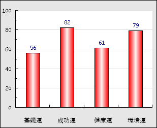 成功運 目的に対する成功運の強さをあらわします。この点数が高いほど自分の思い通りに成功し、逆に悪いと逆境・批判・障害などに苦心します。 82点