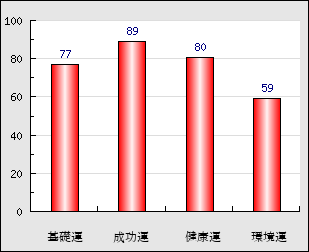 成功運 目的に対する成功運の強さをあらわします。この点数が高いほど自分の思い通りに成功し、逆に悪いと逆境・批判・障害などに苦心します。 89点