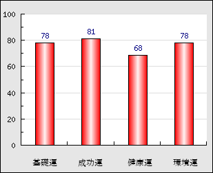 環境運 家庭や職場等での援助運・環境運を司ります。これが良いと配偶者や子供・職場の同僚などから助力が得られやすく、悪いと波乱・不和・孤独などがあります。 78点