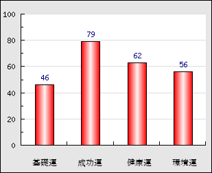 成功運 目的に対する成功運の強さをあらわします。この点数が高いほど自分の思い通りに成功し、逆に悪いと逆境・批判・障害などに苦心します。 79点
