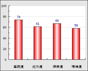 成功運 目的に対する成功運の強さをあらわします。この点数が高いほど自分の思い通りに成功し、逆に悪いと逆境・批判・障害などに苦心します。 61点