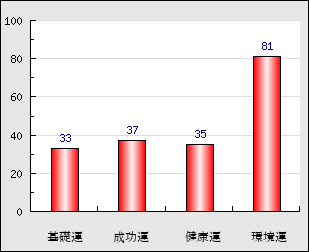 成功運 目的に対する成功運の強さをあらわします。この点数が高いほど自分の思い通りに成功し、逆に悪いと逆境・批判・障害などに苦心します。 37点